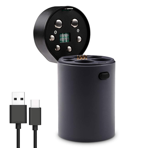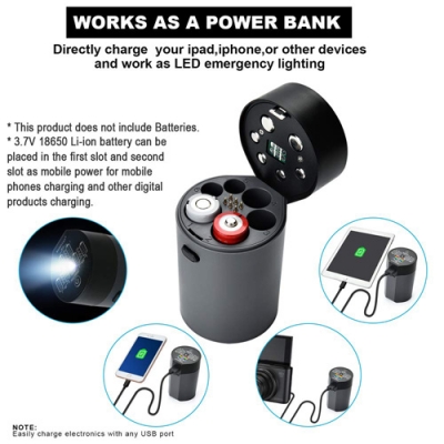 1. The unlock key on the side of the cylindrical charger body Press unlock key to open the upper cover, which can take out or placed in rechargeable batteries. 2. The Power key on the Display panel: A. Long press power key to turn on LED lighting and long press the power key to turn off LED lighting. B. In the product discharge mode, when the Charger 1 slot or 2 slot placed in the 18650 battery, tap the power key, you can activate the battery charger display 18650 battery power energy and USB output port output 5V1A, mobile phones and other digital products can be charging. C. In the discharge mode of the product, when 18650 batteries are placed in the Charger 1 slot or 2 slot (the battery charger is dormant), tap the power key, the LED panel will display 18650 battery power status corresponding to the 1th and 2nd slots (the battery in 3,4,5,6 slot does not do the power display in the discharge mode), At the same time, the USB output can output 5v/1000ma to charge the external digital production. |