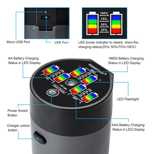 1. Before using, please carefully read the reference in this product manual. 2. This product can only charge rechargeable batteries, such as cylindrical lithium-ion batteries (3.7V), Ni-MH/Ni-CD batteries (1.2V), model size of cylindrical is 18650,AA,AAA. 3. Can’t charge LiFePO4 battery and can not charge disposable dry battery and other chemical-type batteries, if charging other chemical types of batteries, may lead to safety accidents or losses. 4. It is recommended to use the standard genuine mobile phone 5V/2A USB Power Adapter to power this product (power adapter recommendation 2 A, less than 2A may reduce charging time and efficiency). 5. This product testing data for reference only, the actual status please refer to professional instruments. 6. When stopping use, unplug the power supply,take out the battery, cover the lid, and store it cleanly. 7. This product is limited to 0-40 degrees of temperature use, to avoid products by water or near the source of fire, do not be exposed to snow or rain, in order to avoid resulting in short circuit or damage to the product. 8. Prohibit any metal objects be placed inside the product in order to avoid the internal battery short circuit. 9. If the micro charging plug is inserted in use, the LED power indicator does not blink properly, please check whether the Micro USB plug is in good contact, whether the AC power switch is connected, or whether the 5V2A USB power supply is connected. 10. It is recommended to use this product dedicated micro USB charging cable, otherwise it may cause the inability to charge properly or the charging speed will decrease. 11. Charging process, the battery slot has a battery, but the corresponding slot LED lights are not lit, please open the product cover, check whether the battery cathode hardware contact piece is dirty, if there is dirt, may lead to poor contact, please clean and then use, in addition, if the battery positive and negative pole placed reverse, the charger although there is a battery reverse protection function,However, it can also cause the LED indicator to be not lit. 12. After the battery is charged full, for the 3,4,5,6 slot, if the Ni-MH/Ni-CD battery is placed in, unplug the power supply or open the upper cover, turn on the power supply again or cover lid again, for Ni-MH/Ni-CD batteries will have a process to re-identify the battery itself is full, the battery will be 50% or 75% in the LED power indication, which is normal Ni-MH/Ni-CD batteries full of recognition process, continue to charge about 10 minutes to 30 minutes or so, the LED power indication will normally display full status. 13. Do not disassemble the charger, children must use this charger under the supervision of adults. |