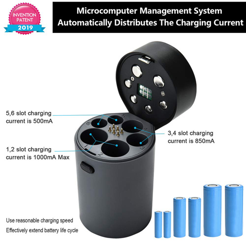 For different slots, the microcomputer management system automatically distributes the charging current, 1,2 slot Charging current is 1000mA Max, 3,4 slot charging current is 850mA, 5,6 slot charging current is 500mA |