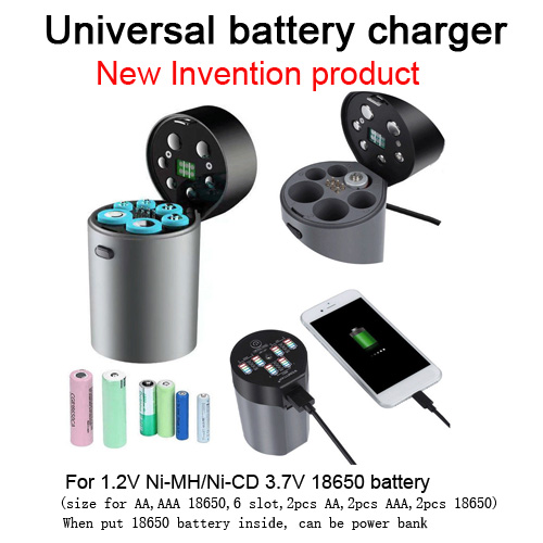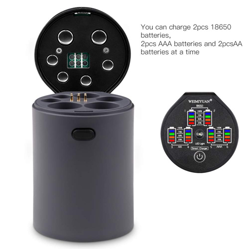 * New invention patented battery charger, with original invention and the latest design of the program charging circuit. * Portable, easy to use, beautiful. * Suitable for rechargeable batteries such as: 3.7V lithium-ion battery, 1.2V Ni-MH/Ni-CD battery, cylindrical size is 18650,AA,AAA, automatic identification of battery type function. * with 0V voltage activation function, in the activation status, the current uses trickle type charging. * This product does not have a battery, but 3.7V 18650 Li-ion battery can be placed in the first slot and second slot as mobile power for mobile phones, mobile phone charging and other digital products charging. * Automatic identification of 3.7V lithium ion, Ni-MH/Ni-CD battery * Power supply using micro USB DC 5v/2a input, six-slot independent charging and microcomputer management system |