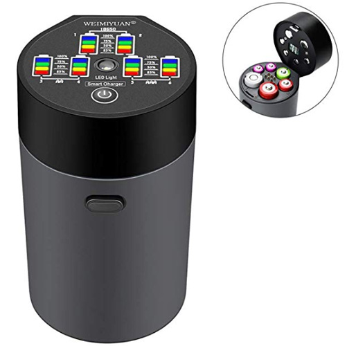 This cylindrical intelligent Charger Display Panel has 6 different sets of LED lamps (each set of 4 color LED lights, red, yellow and green blue), respectively, corresponding to six battery charging slot, do battery power energy percentage indication under charging mode or discharge mode A. In the battery charging mode of this product, 6 sets of batteries will have a corresponding LED light display. B. When this product is in the mode of charging battery, the LED indicator will display battery energy percentage for each slot battery and their charging indication, the red light represents 25% of the battery charged, The yellow light represents 50% of the battery charged, the green light represents 75% of the battery charged, and the blue light represents 100% of the battery charged ,When the LED light is in color flashes, it indicates that this battery is in this power energy percentage stage , the charger is charging it. C. In the discharge mode of this product can be used as a mobile power supply, only 18650 of the battery as the input source of the mobile power supply, only display power energy percentage of 18650 battery in the first slot or the second slot. D. In the discharge mode of this product, only 18650 of the battery as the input source of the mobile power supply, when the first slot or the second slot has placed in 18650 batteries, 6 sets of LED lights flash instantly ,after flashing a second and then extinguished, this is the product's own detection process. E. When the discharge mode of this product as a mobile power function, the LED on the display panel only display 18650 battery power energy percentage in the 1th and 2nd slot (only 18650 batteries as the input source of the mobile power supply, the other 3,4,5,6 slot battery is not used as the input source of the mobile power supply, so in the discharge mode, the display panel with its corresponding LED 3, 4,5,6 slot does not do power energy percentage display), when the 1th slot or the 2nd slot has 18650 batteries, cover the lid, LED lights in full light 1 seconds (this product itself is in self-test), display panel will display the corresponding slot 18650 battery power, when the USB output is detected connected to the corresponding load electronics product,the USB port will continue to power the electronics product until the 18650 power energy used up and the LED light on the display panel is extinguished |